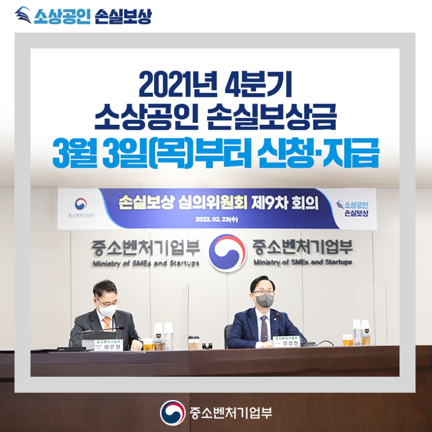 중소벤처기업부는 22년 3월 3일(목) 오전 9시부터 온라인을 통해 4분기 소상공인 손실보상금을 지급합니다.