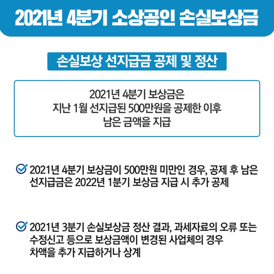 2021년 4분기 보상금은 지난 1월 선지급된 500만원을 공제한 이후 남은 금액이 지급됩니다. 만약 2021년 4분기 보상금이 500만원 미만인 경우, 공제 후 남은 선지급금은 2022년 1분기 보상금 지급시 추가 공제될 예정입니다. 또는 2021년 3분기 손실보상금 정산 결과, 과세자료의 오류 또는 수정신고 등으로 보상금액이 변경된 사업체의 경우 차액을 추가 지급하거나 상계합니다.