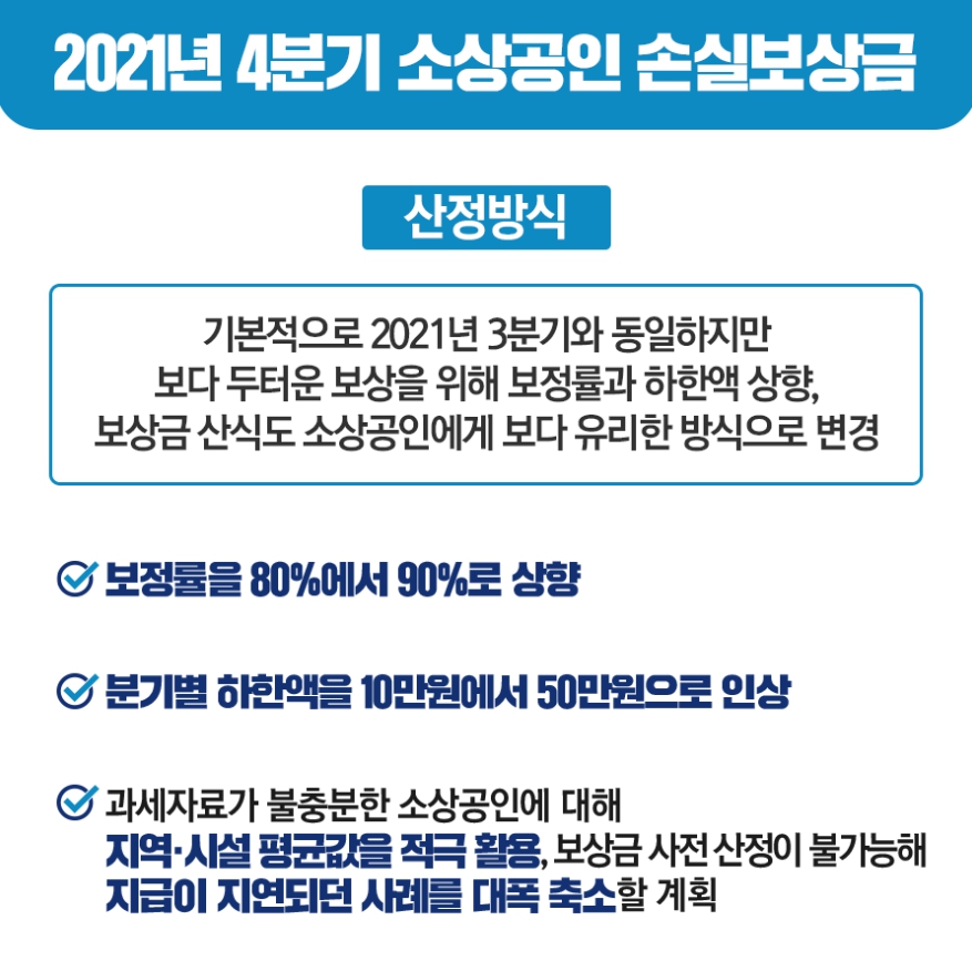 분기별 하한액도 10만원에서 50만원으로 인상돼 매출 규모가 작고 과세자료가 불충분하여 보상금액이 적은 영세 소상공인 등이 보다 두텁게 보상받을 수 있을 것으로 보입니다.