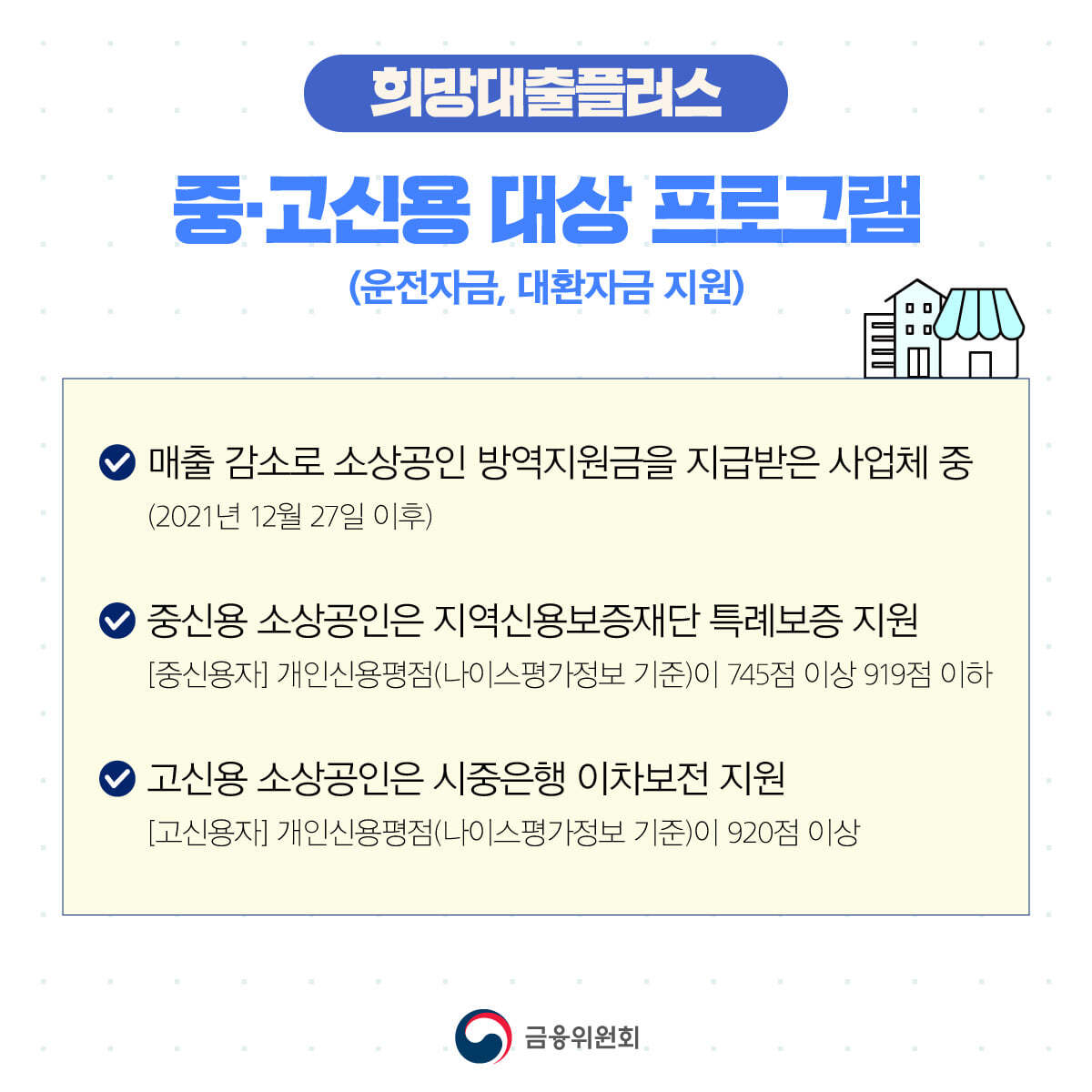 희망대출플러스는 저신용·중신용·고신용 상품 중 1가지만 신청할 수 있습니다. 이 중 1월 24일부터 신청이 시작되는 희망대출플러스는 2021년 12월 27일 이후 매출 감소로 피해를 입은 중·고신용자 소상공인이 신청 대상입니다. 실제 대출 가능 여부는 대출 연제, 세금 체납 여부 등을 감안하여 은행의 대출심사 결과 달라질 수 있습니다.