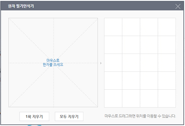 잘 못 입력했을 경우 1'획 지우기' 나 '전체 지우기' 를 눌러 다시 입력할 수 있습니다. 한자 추천 영역에서 원하는 한자를 선택하면 바로 검색창으로 입력됩니다.