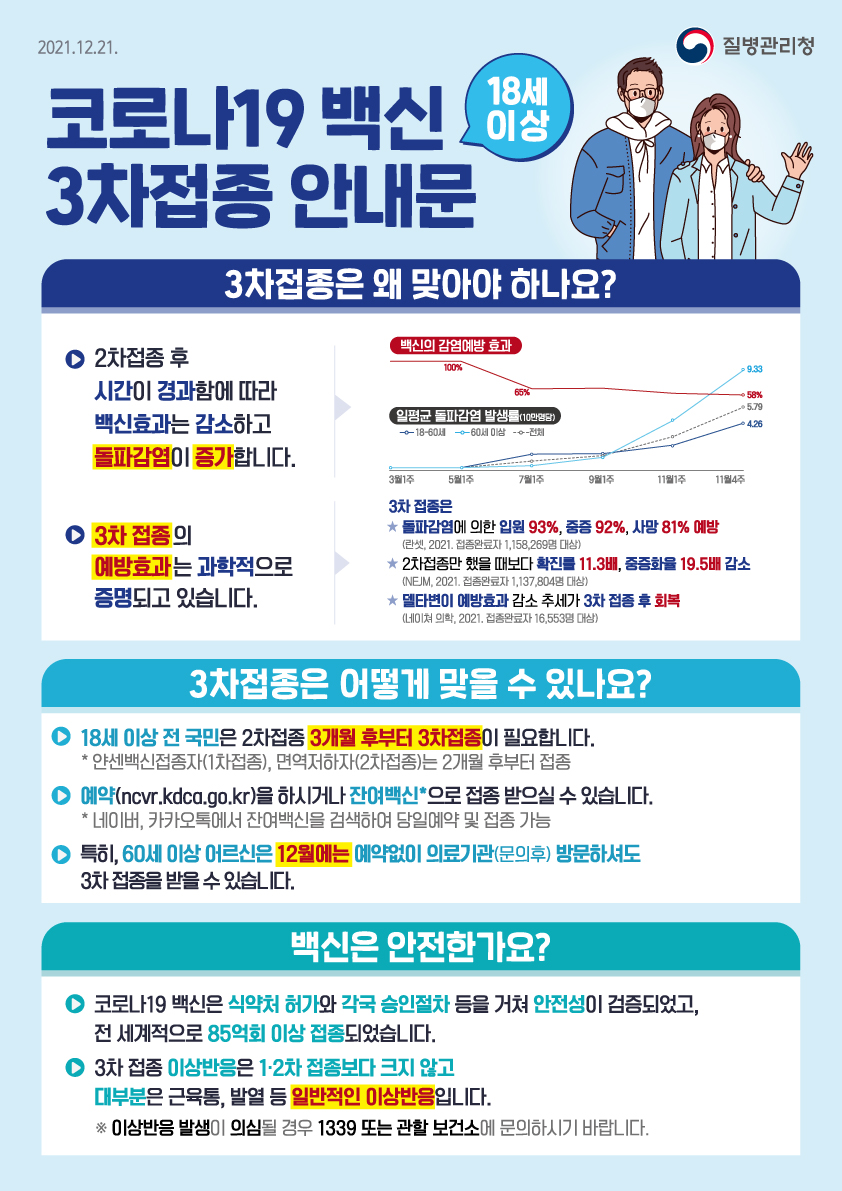 신종 코로나 바이러스 감염증(코로나19) 백신 접종 3차 사전예약을 시작합니다. 대상은 백신 기본 접종 3개월이 지난 18세 이상 성인입니다.